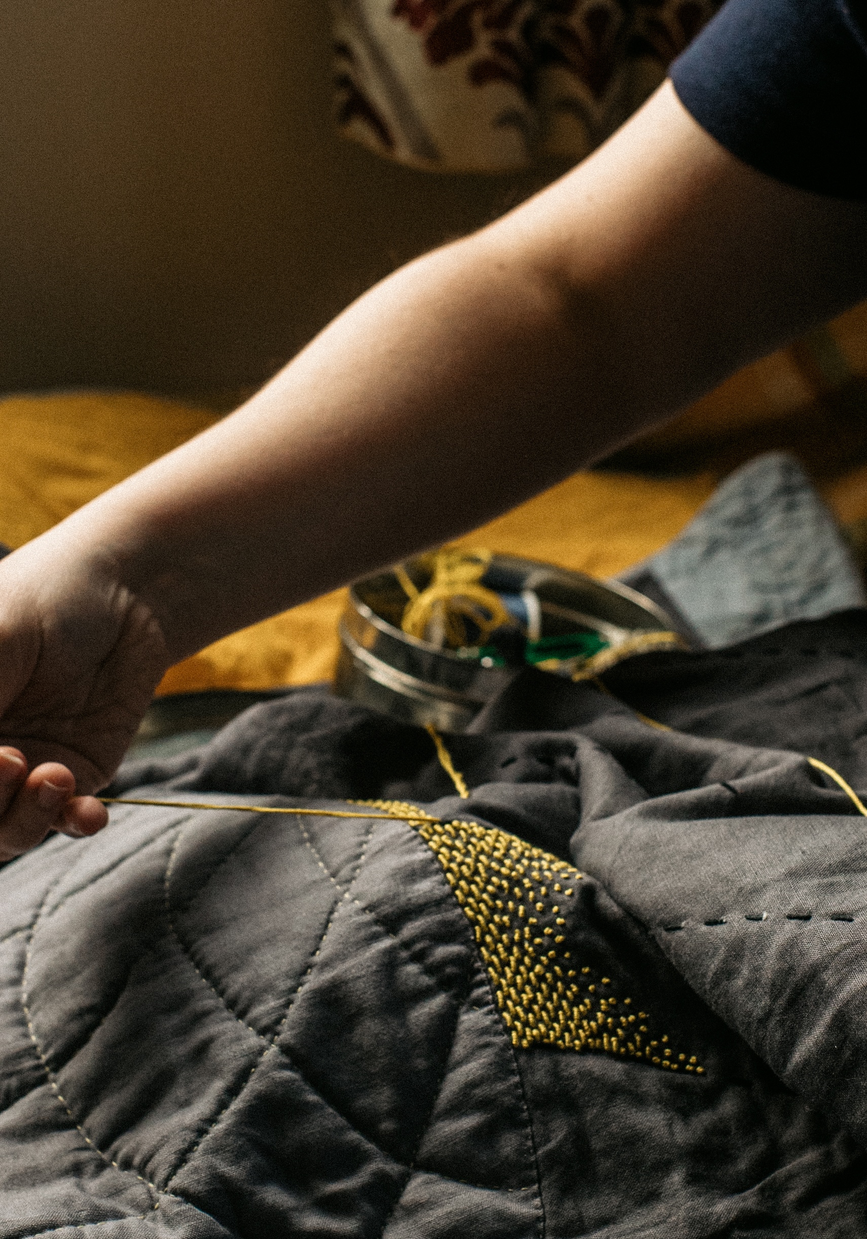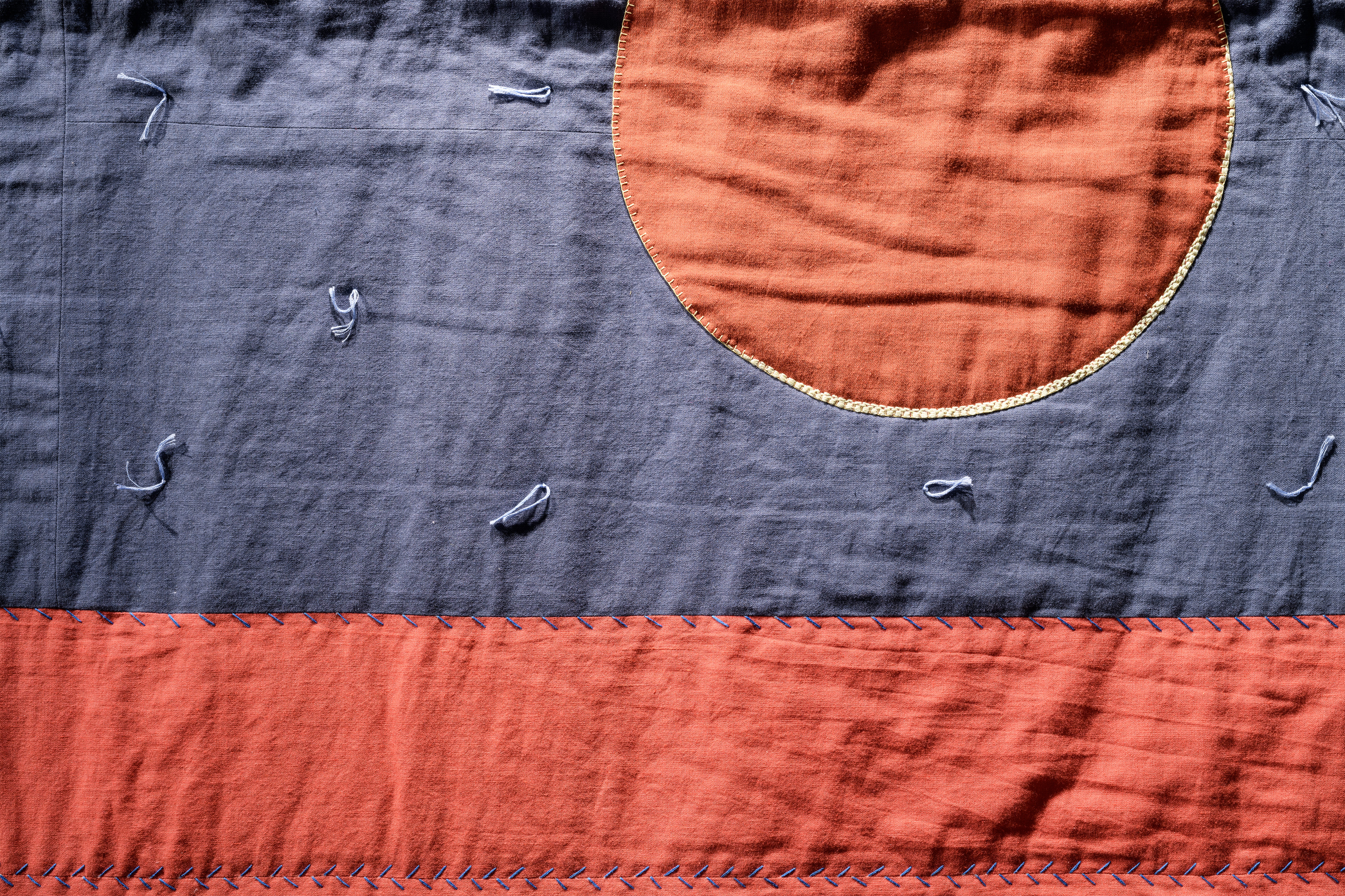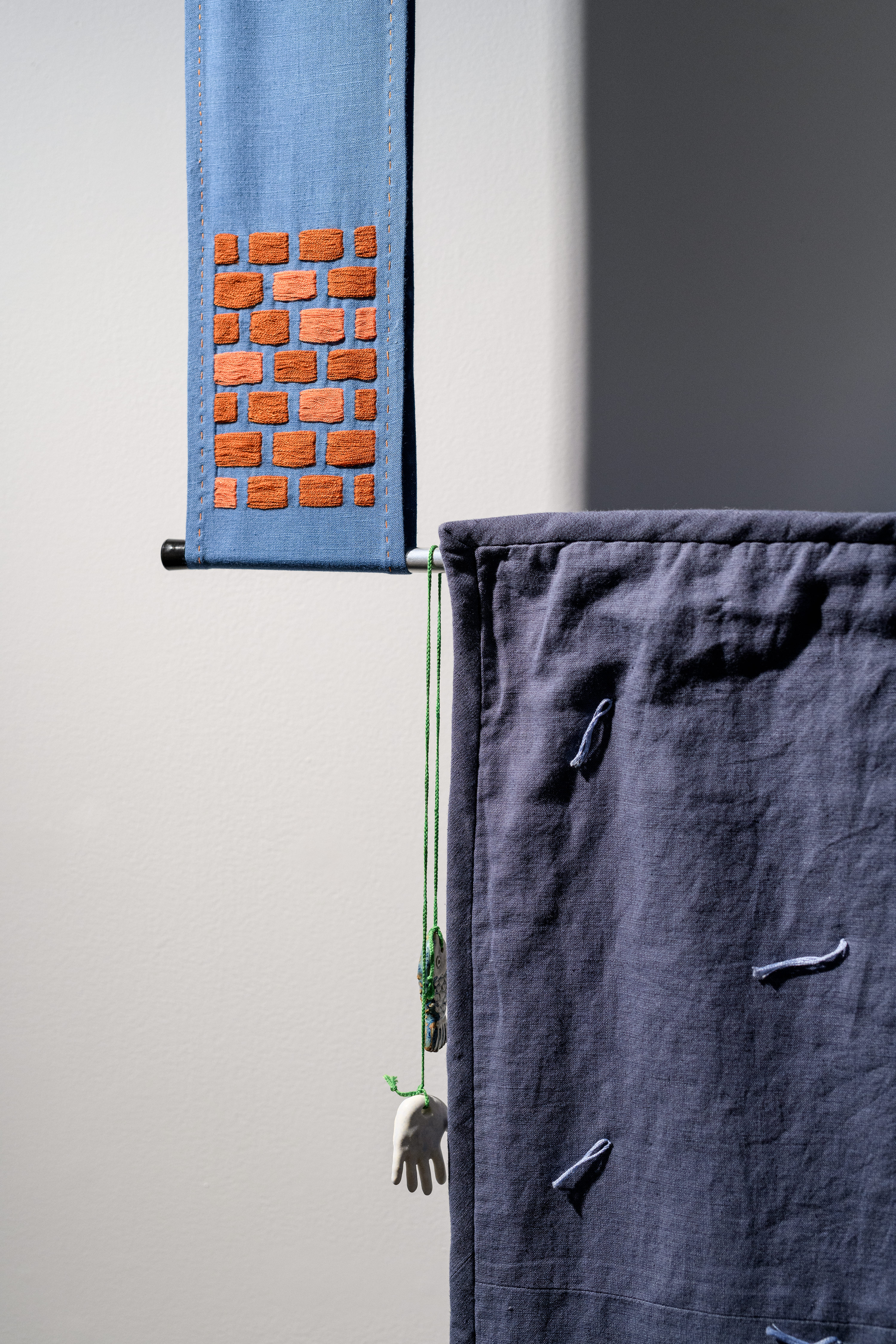 In the Abstract (a Rock, an Island) (2025) (detail). Acid-dyed and quilted linen-cotton, and ceramic. 1280mm x 1540mm. Exhibition view: I can’t shake the stranger out of you, Centre of Contemporary Art Toi Moroki, Ōtautahi (2025). Photo: Owen Spargo.