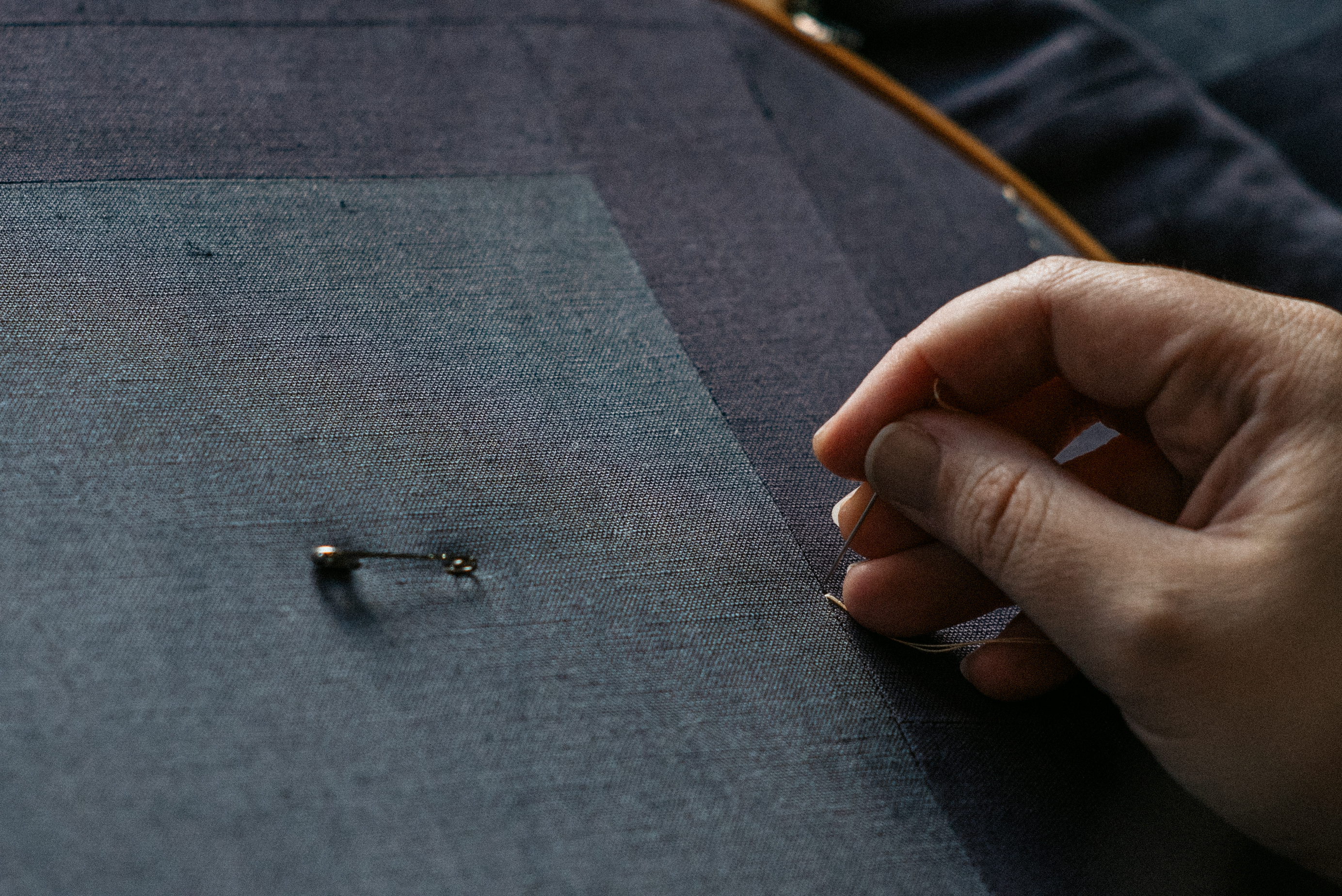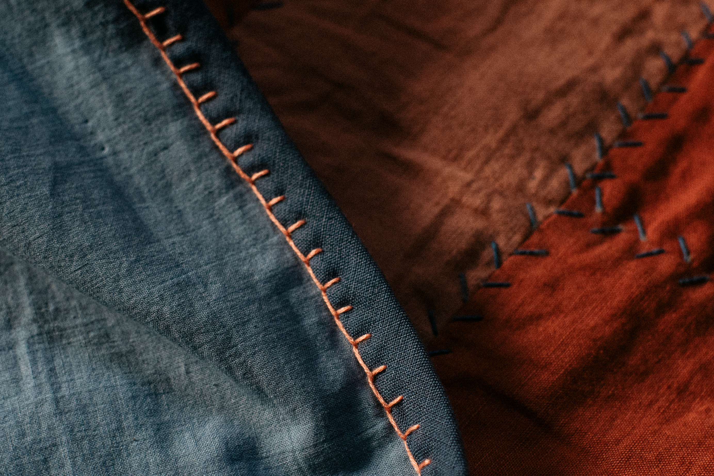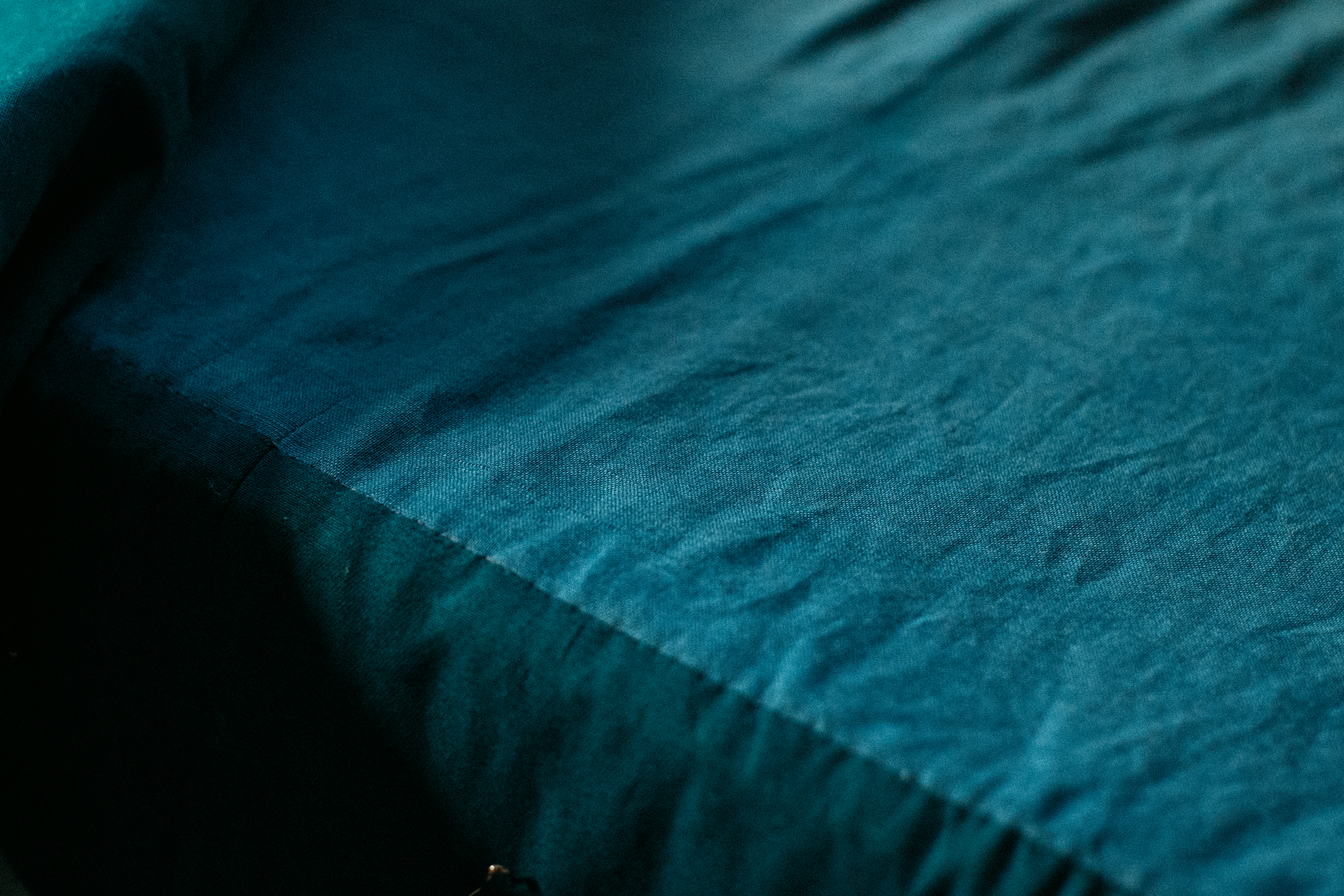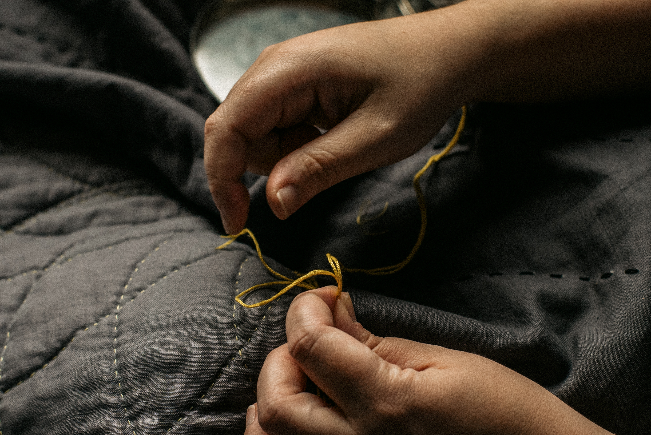 In the Abstract (a Rock, an Island) (2025) (detail). Acid-dyed and quilted linen-cotton, and ceramic. 1280mm x 1540mm. Exhibition view: I can’t shake the stranger out of you, Centre of Contemporary Art Toi Moroki, Ōtautahi (2025). Photo: Owen Spargo.