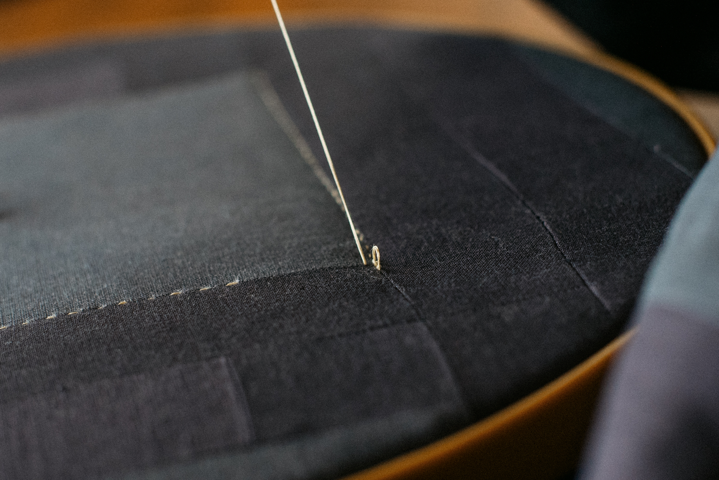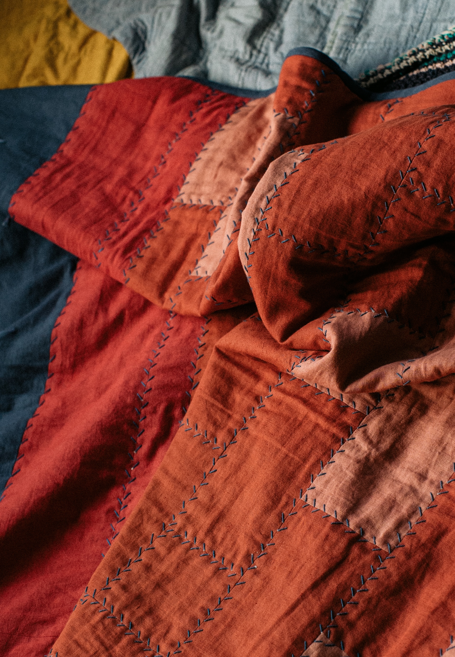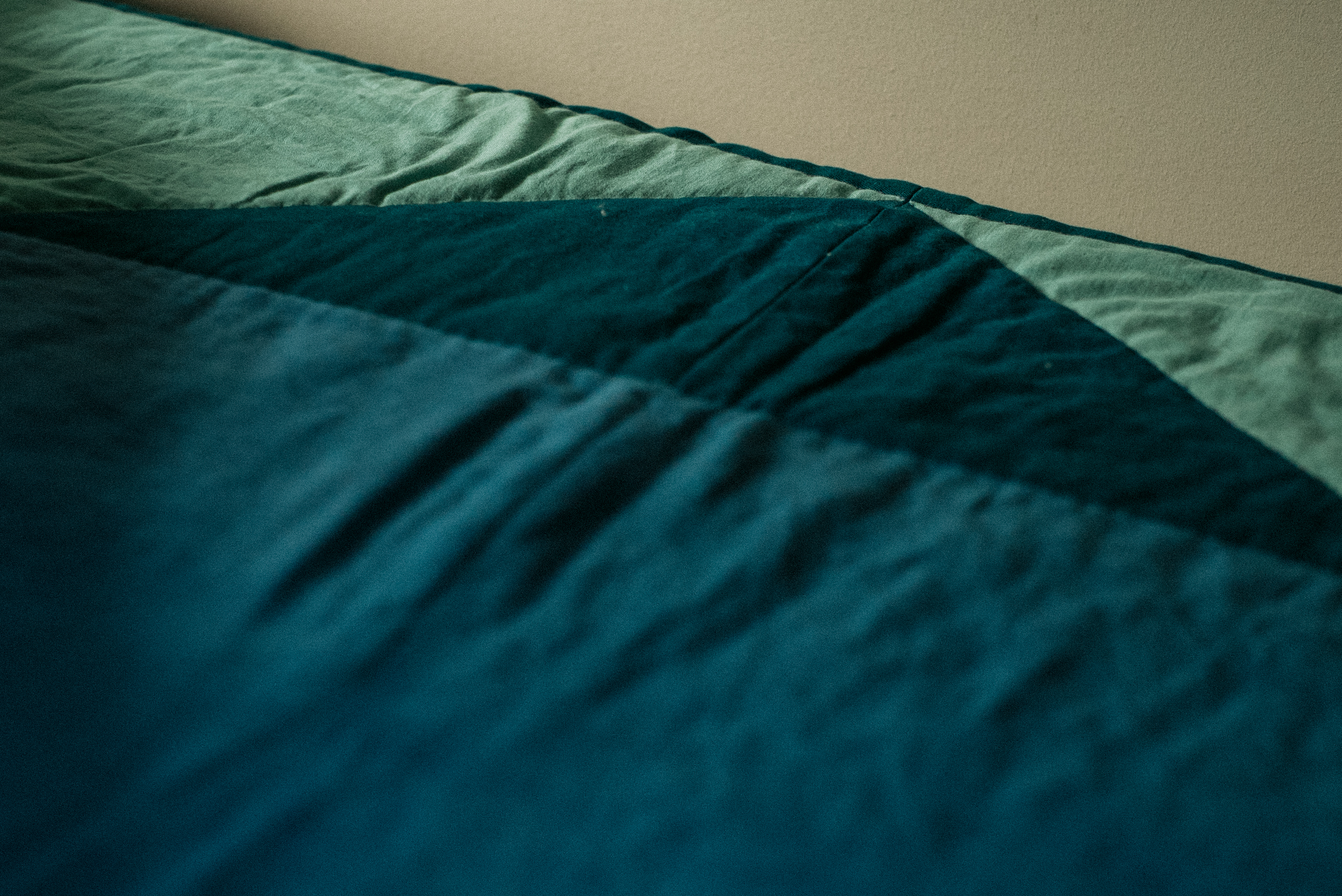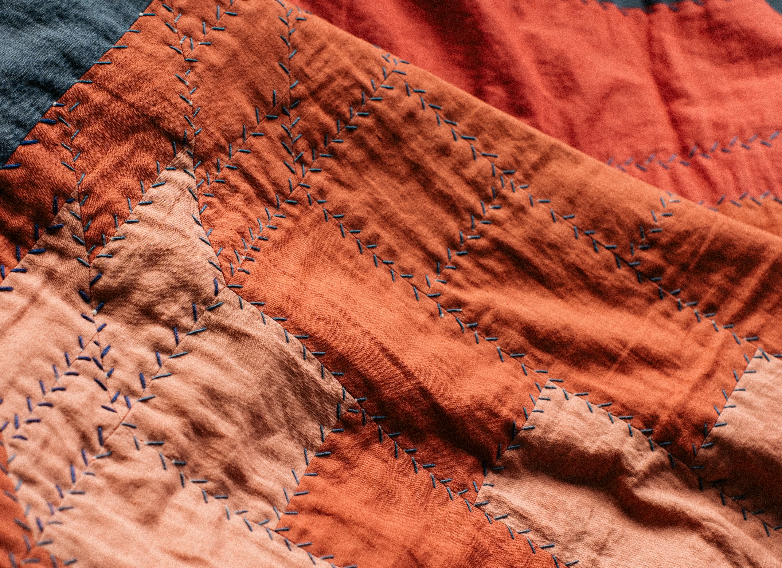 Dance (More Pleasing Shapes) (2025) (detail). Acid-dyed and quilted cotton and linen-cotton. 1359mm x 1359mm. Exhibition view: I can’t shake the stranger out of you, Centre of Contemporary Art Toi Moroki, Ōtautahi (2025). Photo: Owen Spargo.