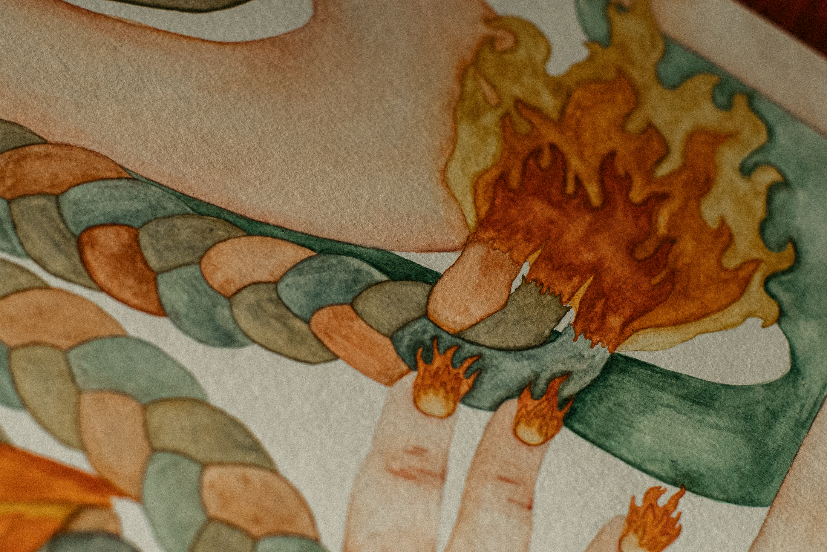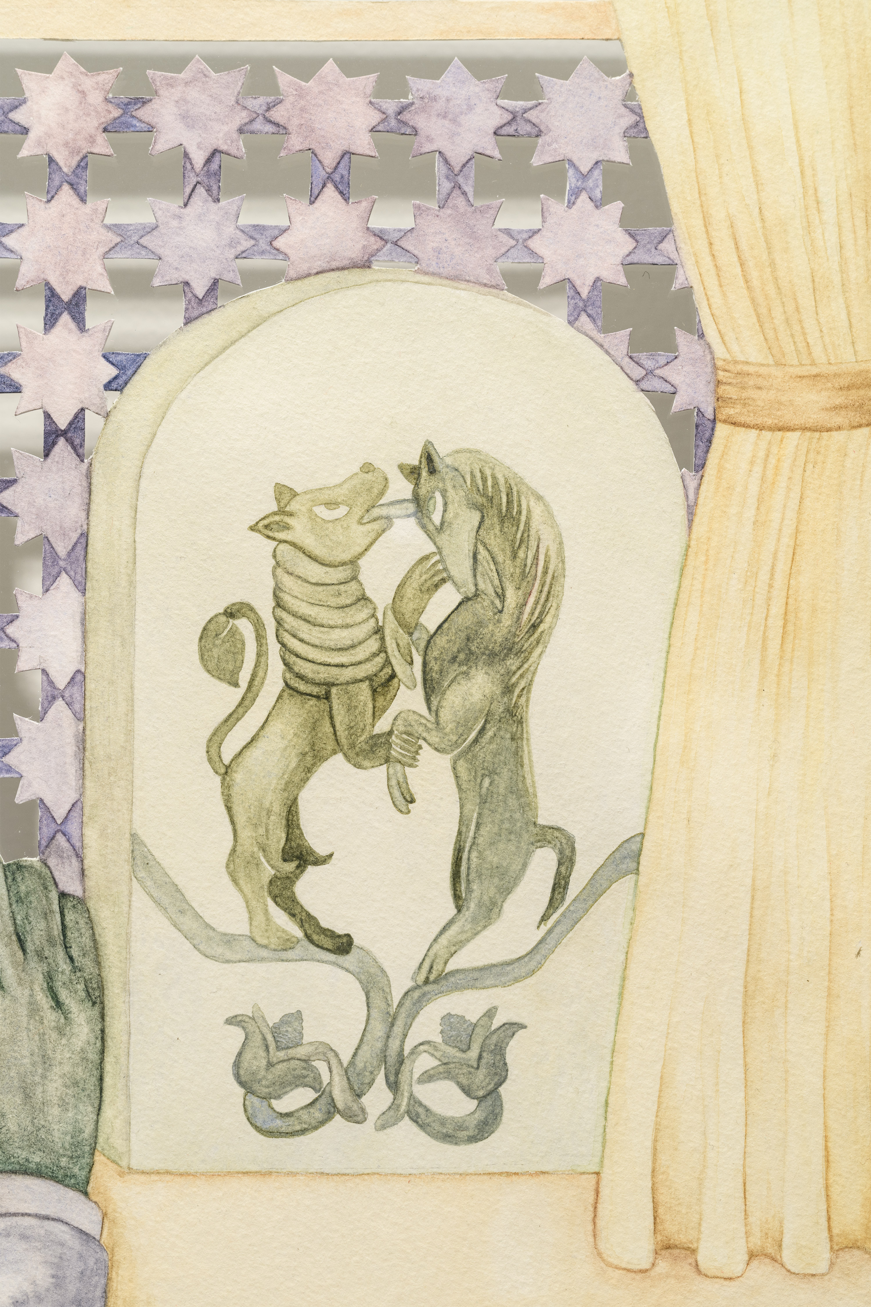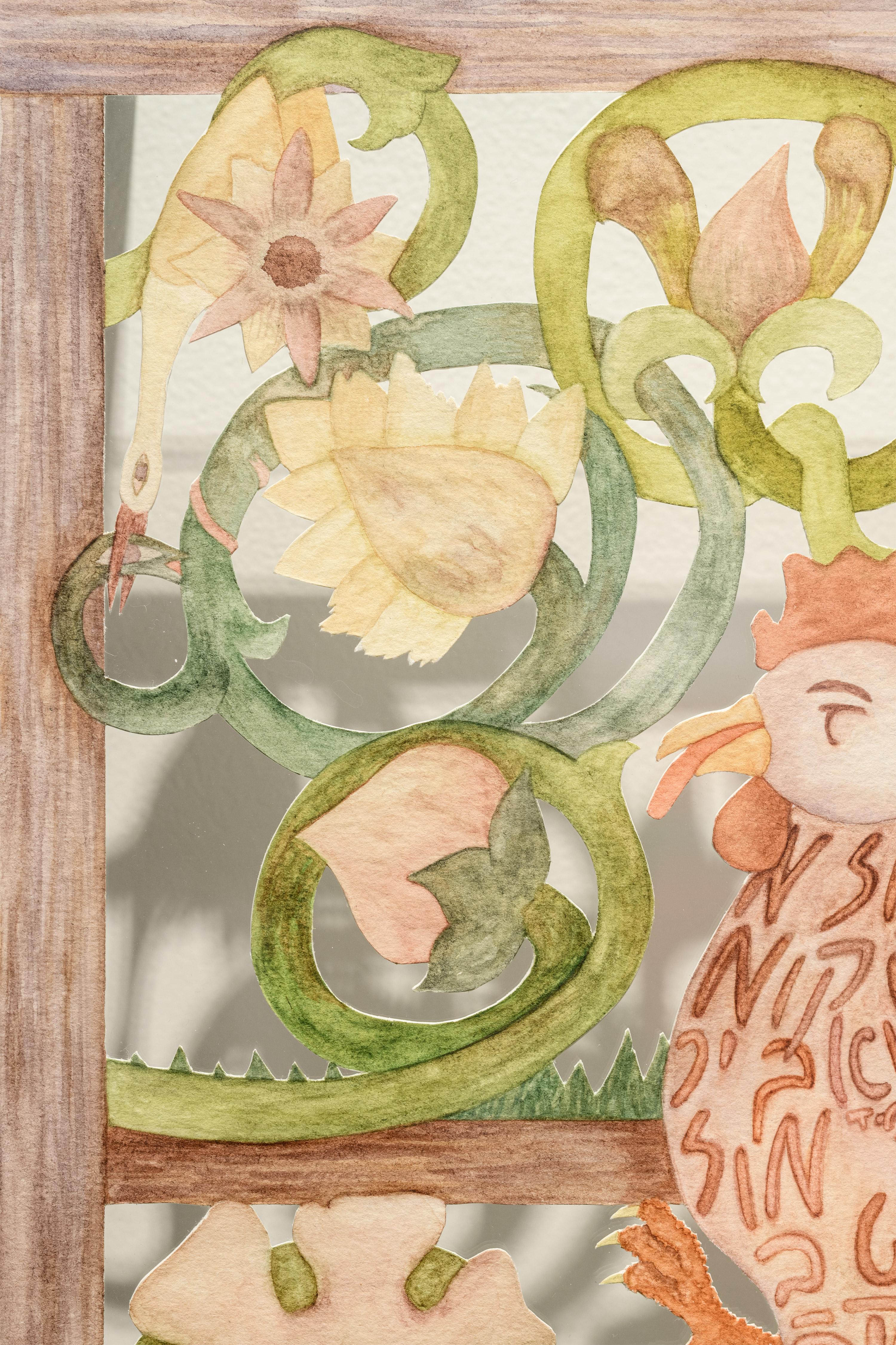 Eternal (Gag) (2025) (detail). Watercolour on paper. 296mm x 416mm. Exhibition view: I can’t shake the stranger out of you, Centre of Contemporary Art Toi Moroki, Ōtautahi (2025). Photo: Owen Spargo.