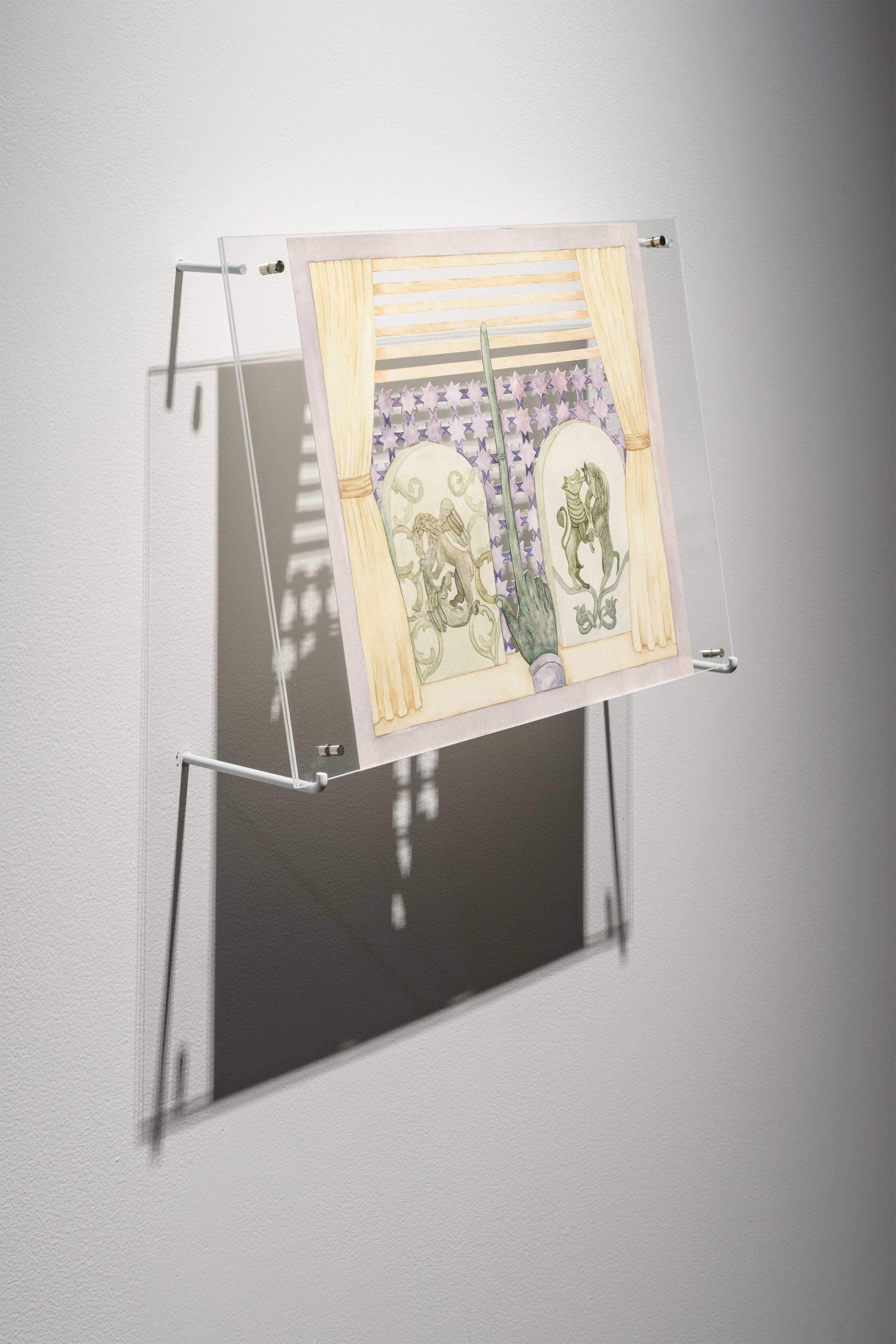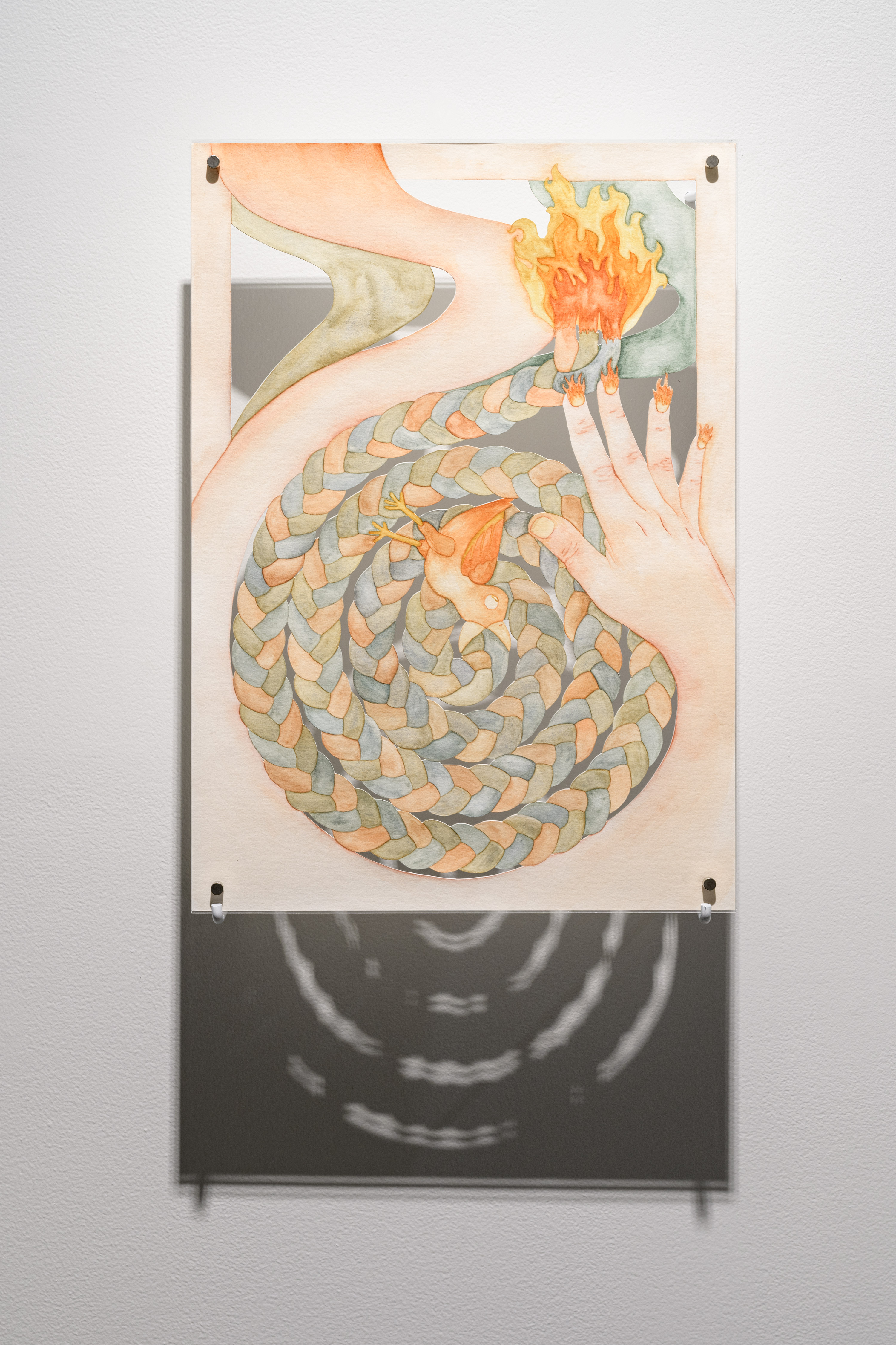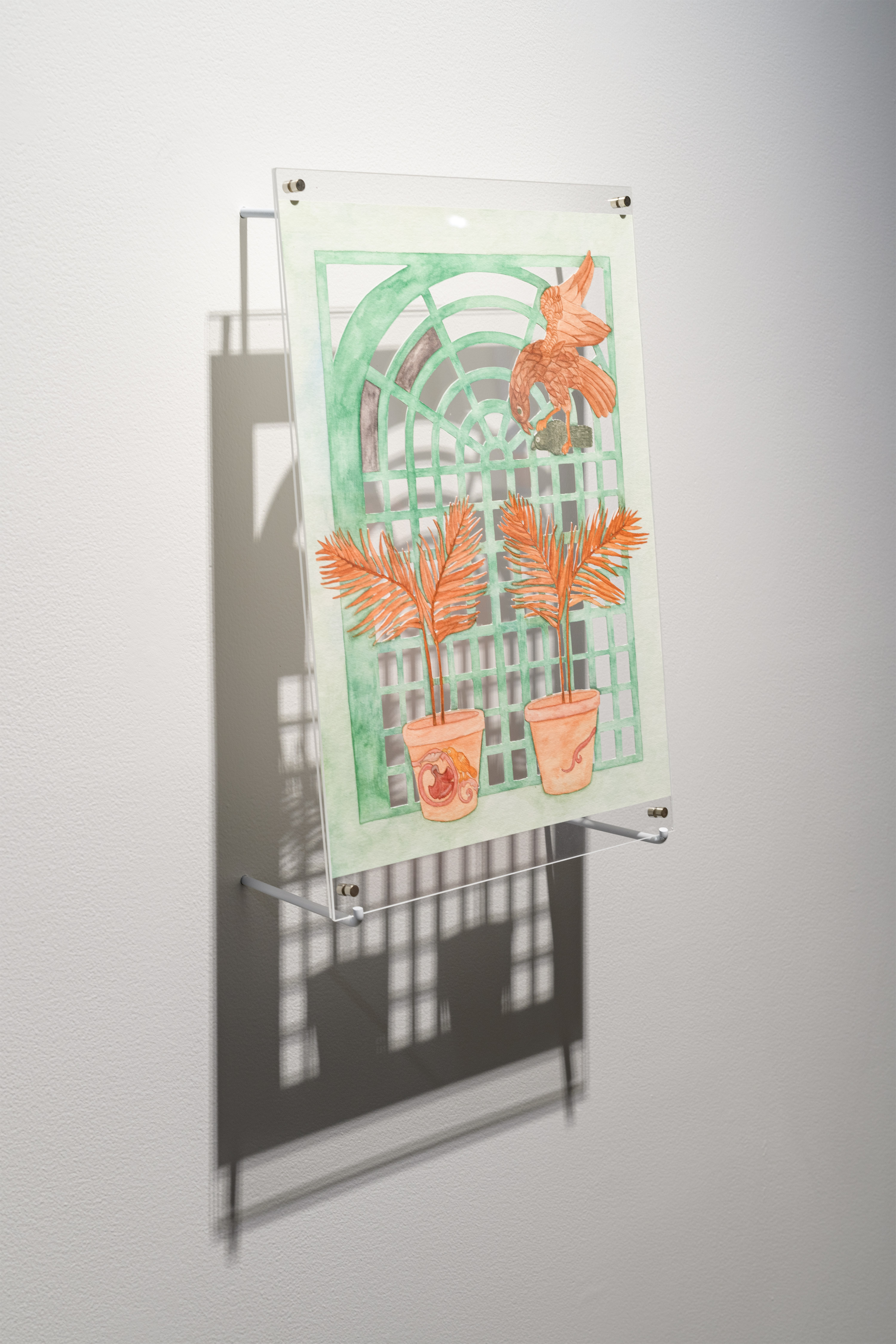 Mirror (2025). Watercolour on paper. 296mm x 378mm. Exhibition view: I can’t shake the stranger out of you, Centre of Contemporary Art Toi Moroki, Ōtautahi (2025). Photo: Owen Spargo.