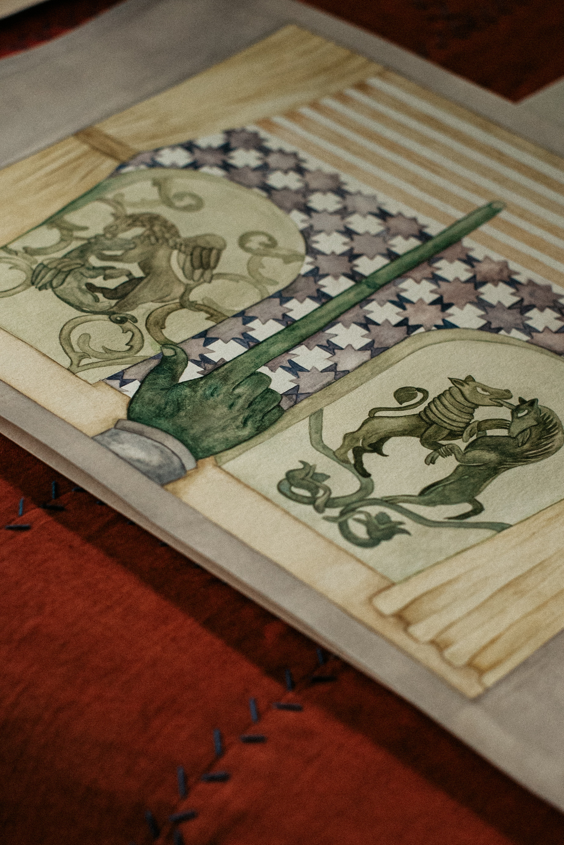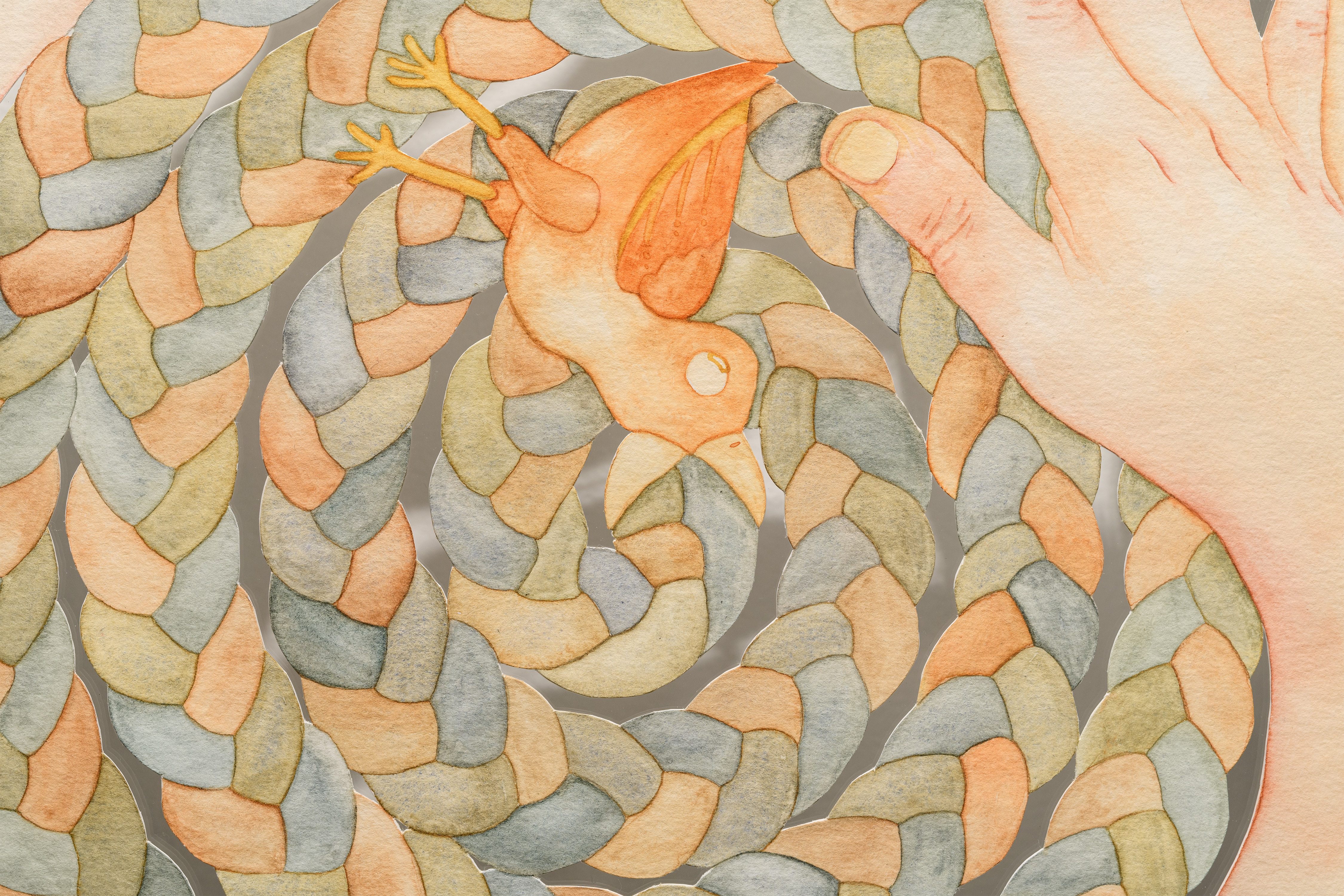 What should I be hearing (2025) (detail). Watercolour on paper. 296mm x 375mm. Exhibition view: I can’t shake the stranger out of you, Centre of Contemporary Art Toi Moroki, Ōtautahi (2025). Photo: Owen Spargo.