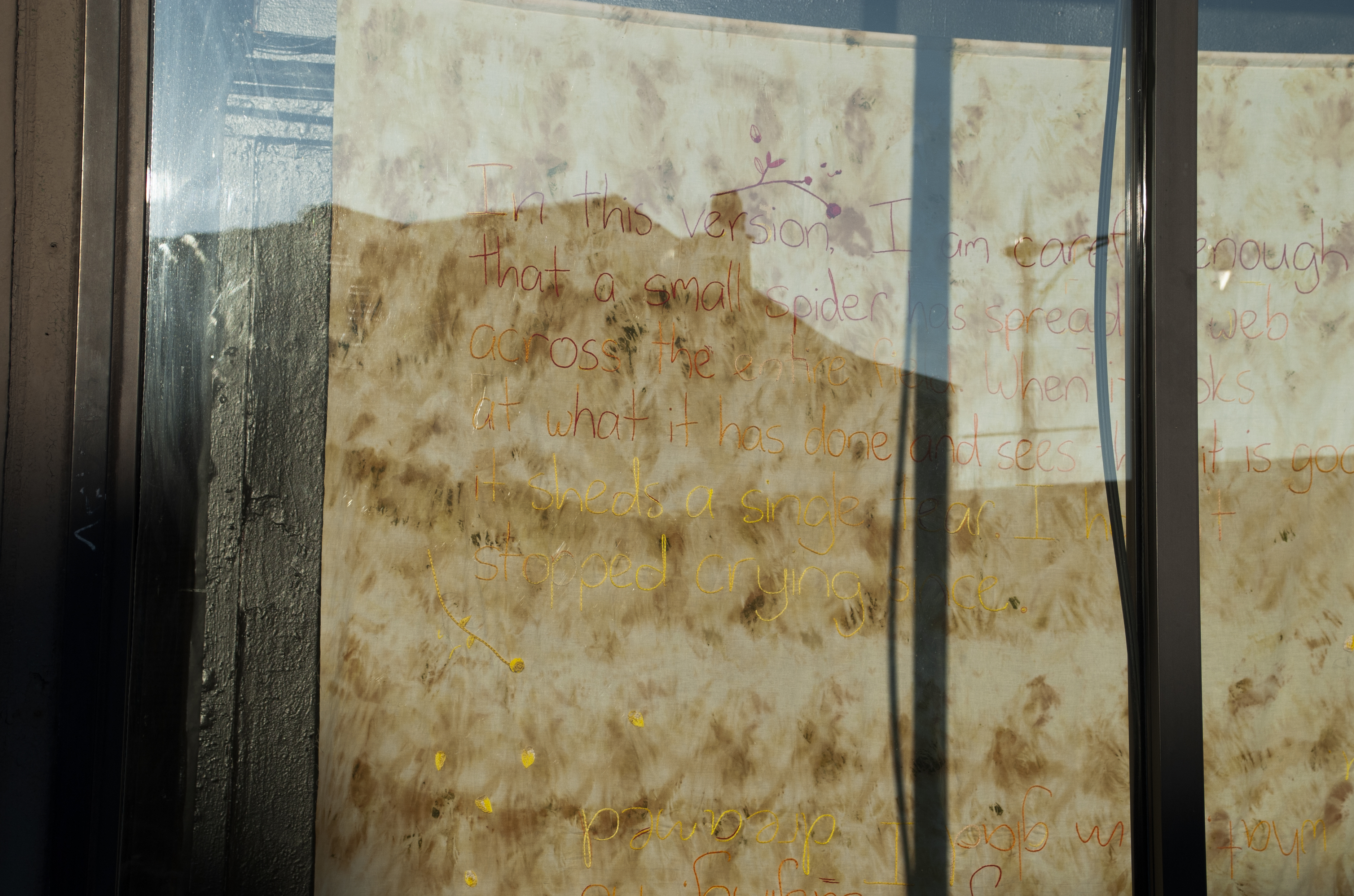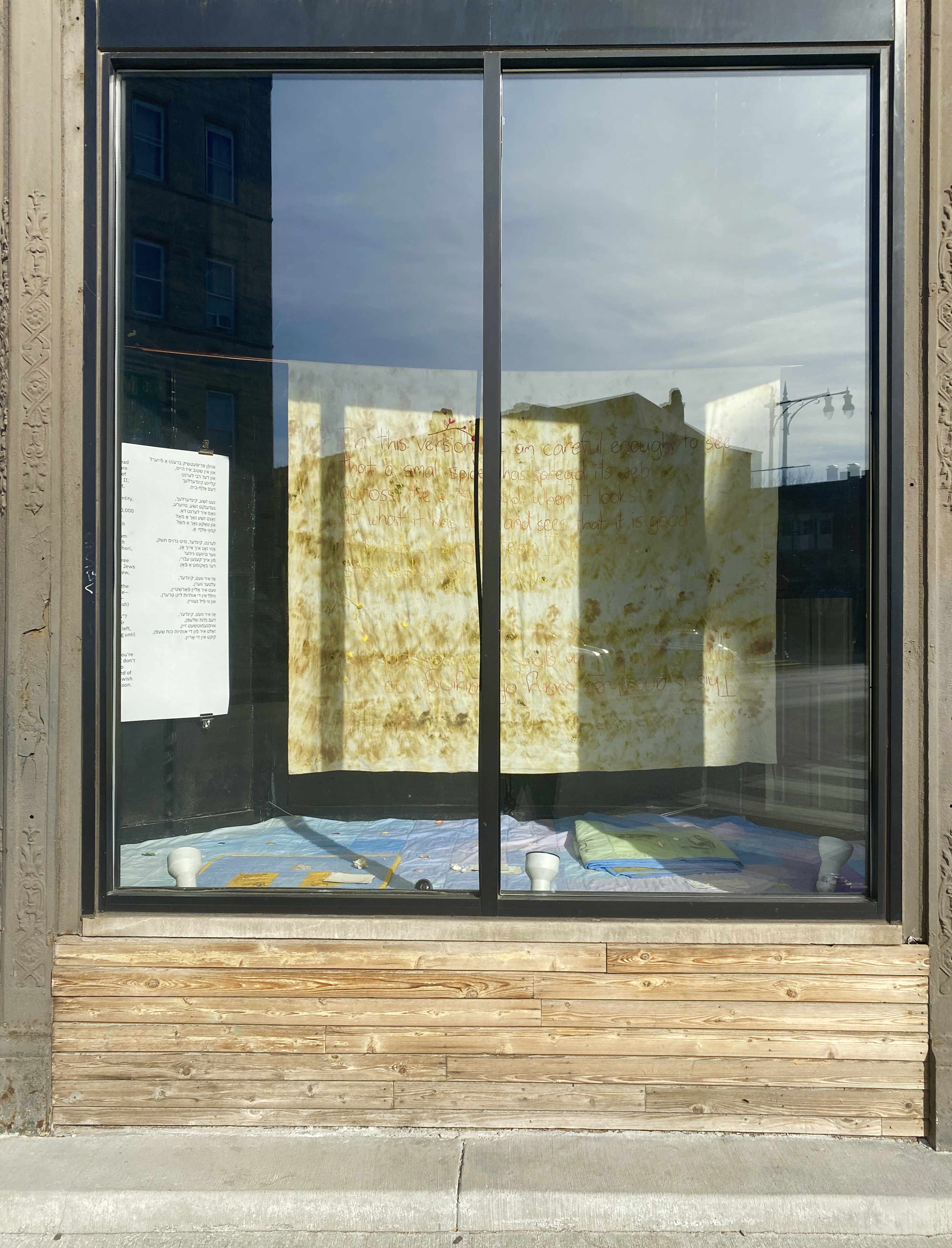 In this version (2020) (detail). Installation: eco-dyed cotton, acid-dyed and quilted cotton, embroidery thread, garlic, ceramic, copper, postcards, and inkjet-printed text on paper. Textile: 5’ x 7’. Exhibition view: Knobl Hearts, Co-Prosperity, Chicago (2020).