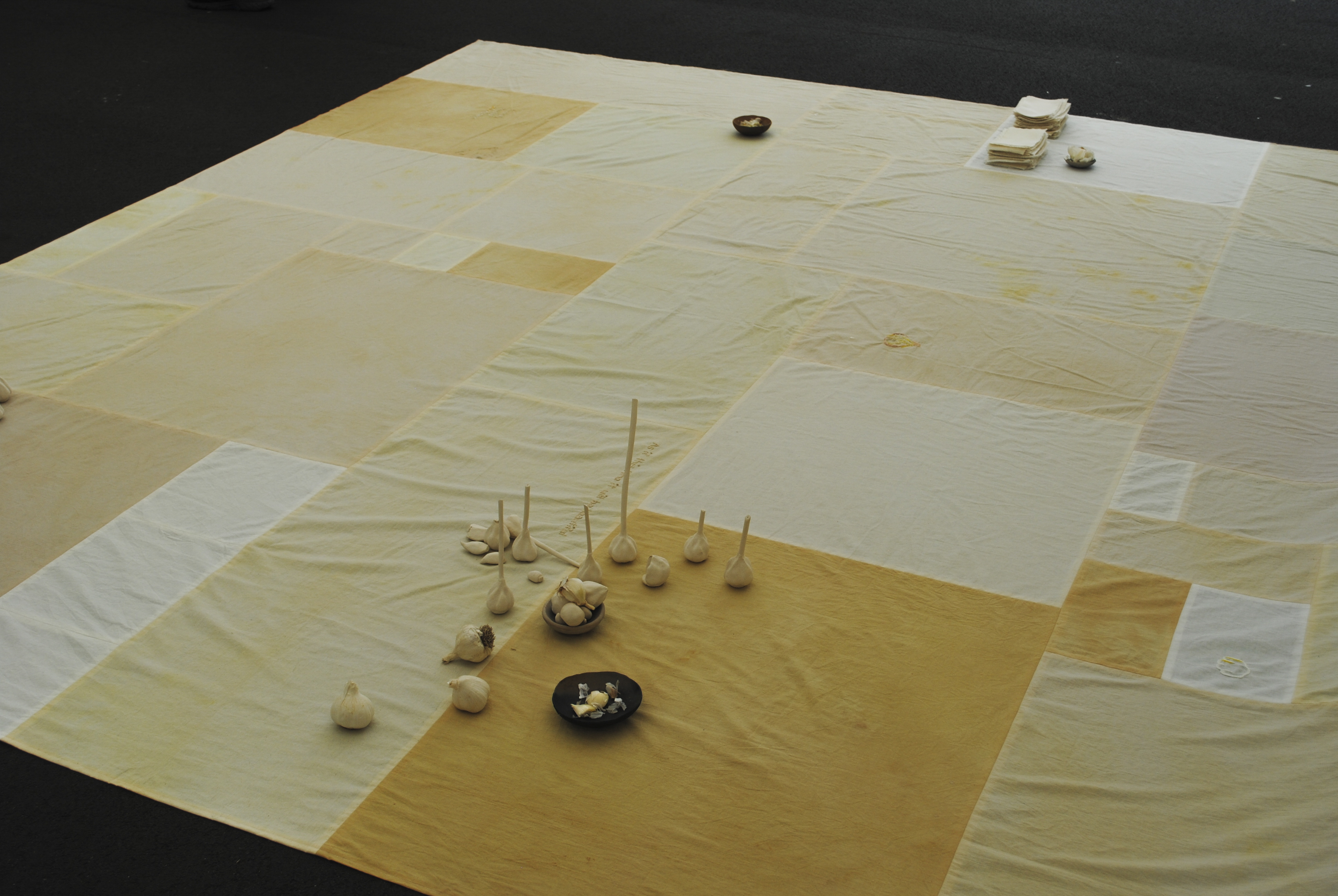 knobl—soup! (detail) (2020–2021). Installation: onionskin-, avocado-, and garlic-dyed cotton, ceramic, thread, garlic, wood, and steel, dimensions variable. Exhibition view: Projects 2021, Auckland Art Fair (2021). Photo: Jordan Davey-Emms.